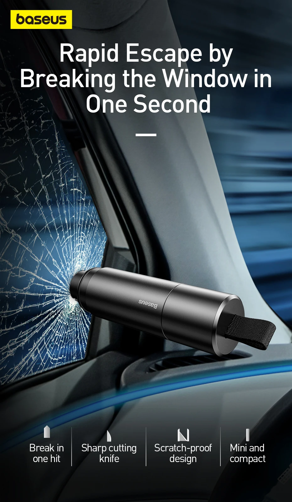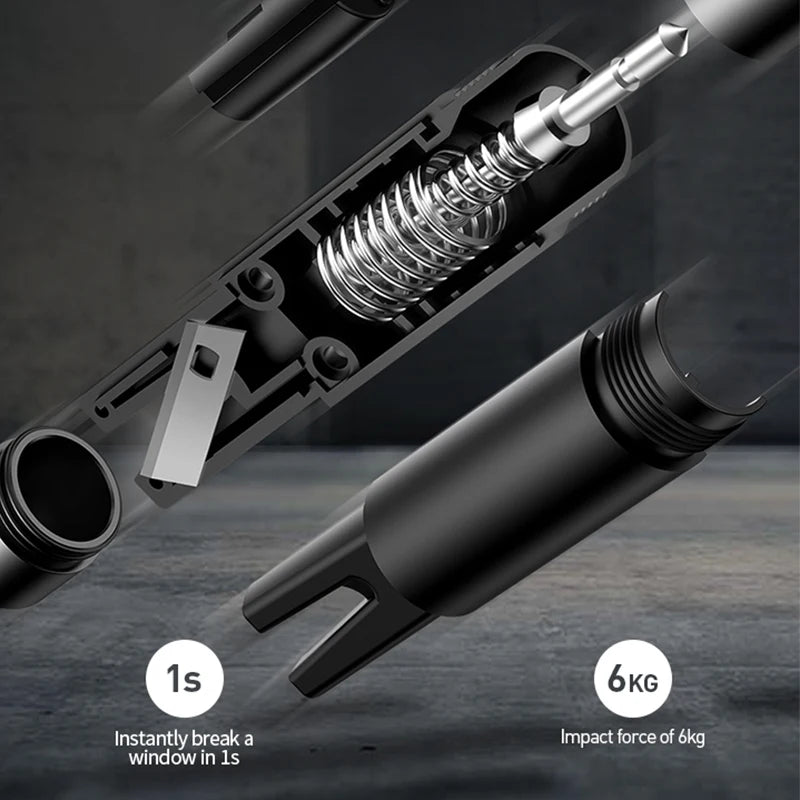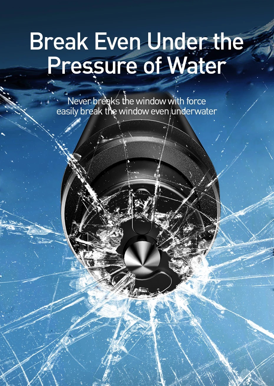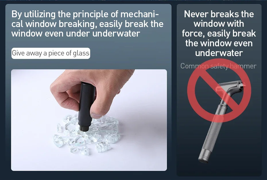 Durch den Einsatz des Prinzips des mechanischen Fensterbruchs können Sie das Fenster auch unter Wasser problemlos zerbrechen. Der integrierte Edelstahlschneider hilft Ihnen, im Gefahrenfall ein Sicherheitsgurt schnell und einfach abzuschneiden.