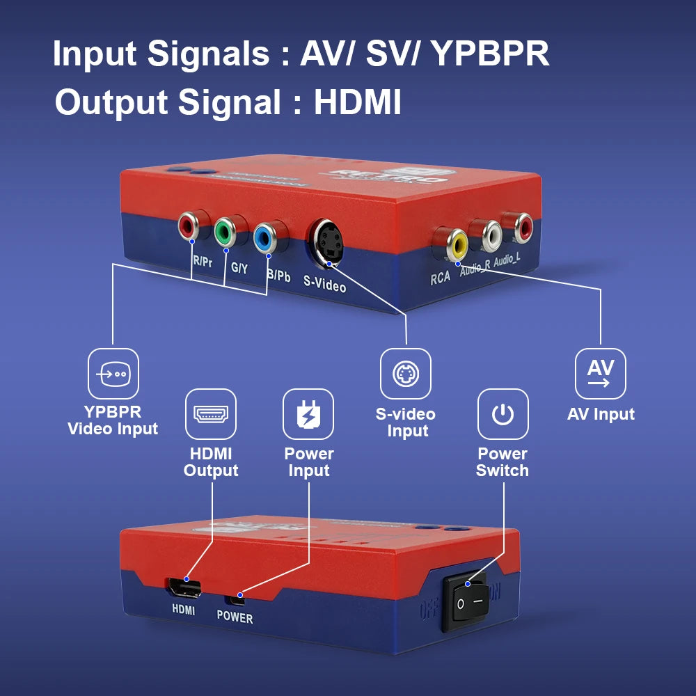 2.RetroScaler2X UnterstützungKomponente / AV/ SVSignaleingang.Bitte prüfen Sie vor dem Kauf, ob Ihre Spielekonsole diese drei Videosignale ausgeben kann.